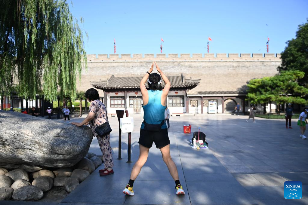 Photo taken on June 12, 2024 shows a resident stretching near ancient city wall in Xi'an, northwest China's Shaanxi Province. Xi'an, a city with over 3,100 years of history, served as the capital for 13 dynasties in Chinese history. It is also home to the world-renowned Terracotta warriors created in the Qin Dynasty (221-207 BC).