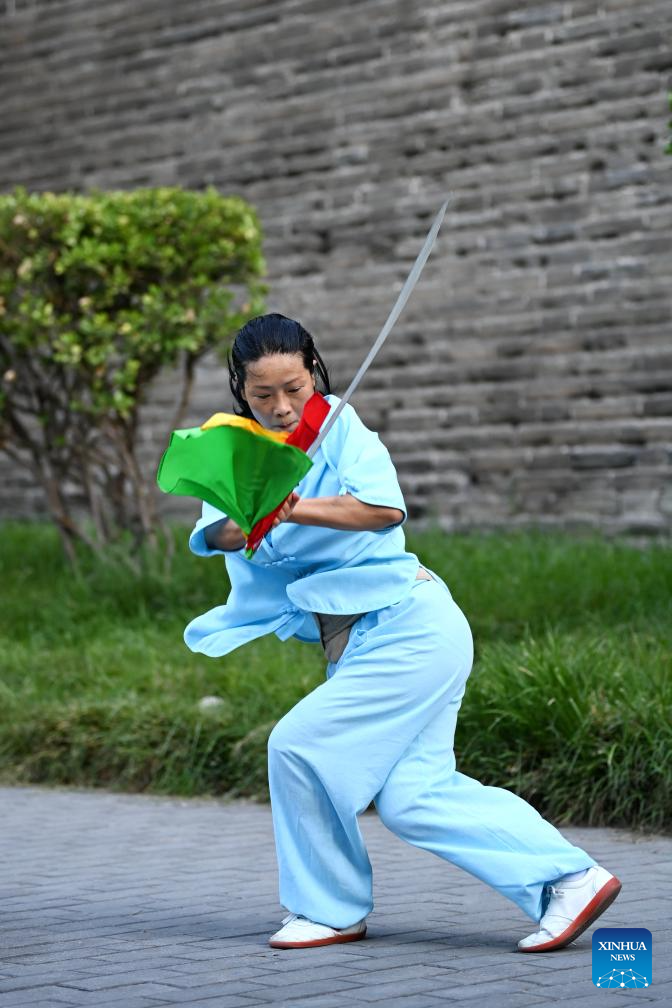 Photo taken on June 12, 2024 shows residents practicing Wushu near ancient city wall in Xi'an, northwest China's Shaanxi Province. Xi'an, a city with over 3,100 years of history, served as the capital for 13 dynasties in Chinese history. It is also home to the world-renowned Terracotta warriors created in the Qin Dynasty (221-207 BC).