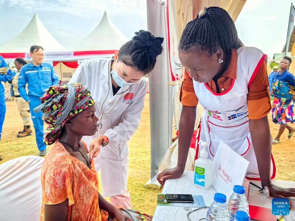 A doctor from the Chinese medical team in Uganda checks on a local resident during a medical camp in Uganda's western district of Kikuube, June 19, 2024. The Chinese oil giant China National Offshore Oil Corporation (CNOOC) in Uganda is holding a two-day medical camp in the country's western district of Kikuube, where hundreds of local residents are being provided with free medical services and treatments.(Photo by Tian Yu/Xinhua)