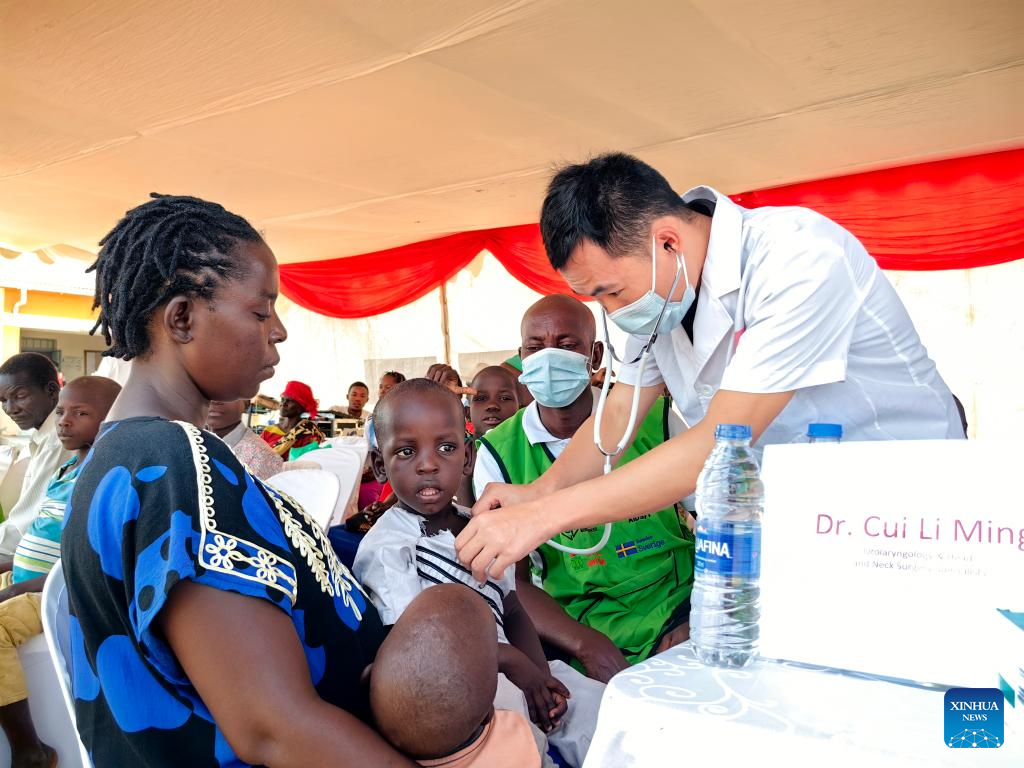 A doctor from the Chinese medical team in Uganda checks on a child during a medical camp in Uganda's western district of Kikuube, June 19, 2024. The Chinese oil giant China National Offshore Oil Corporation (CNOOC) in Uganda is holding a two-day medical camp in the country's western district of Kikuube, where hundreds of local residents are being provided with free medical services and treatments.(Photo by Tian Yu/Xinhua)
