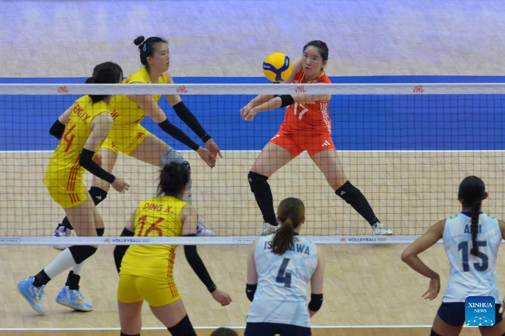 Zheng Yixin (1st L) of China competes during the quarterfinal match between China and Japan at the FIVB Women's Volleyball Nations League (VNL) Finals in Bangkok, Thailand, June 20, 2024. (Xinhua/Rachen Sageamsak)