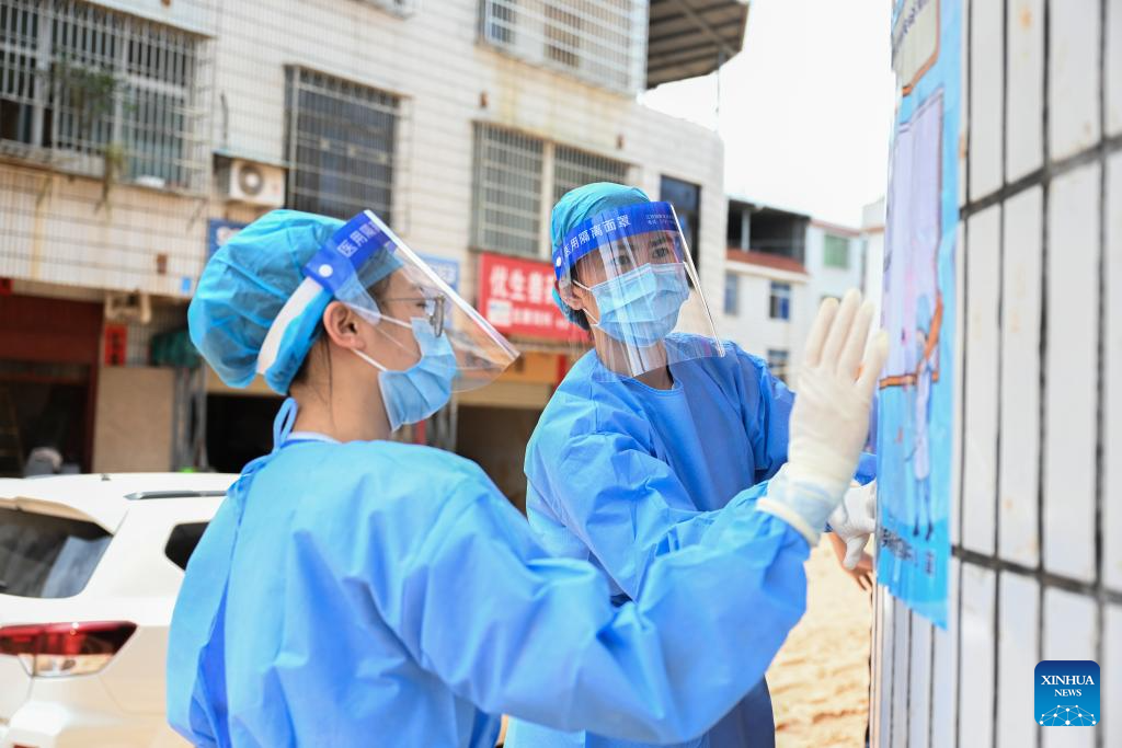 Epidemic prevention workers put up posters in Wuping County of Longyan City, southeast China's Fujian Province, June 20, 2024. (Xinhua/Zhou Yi)