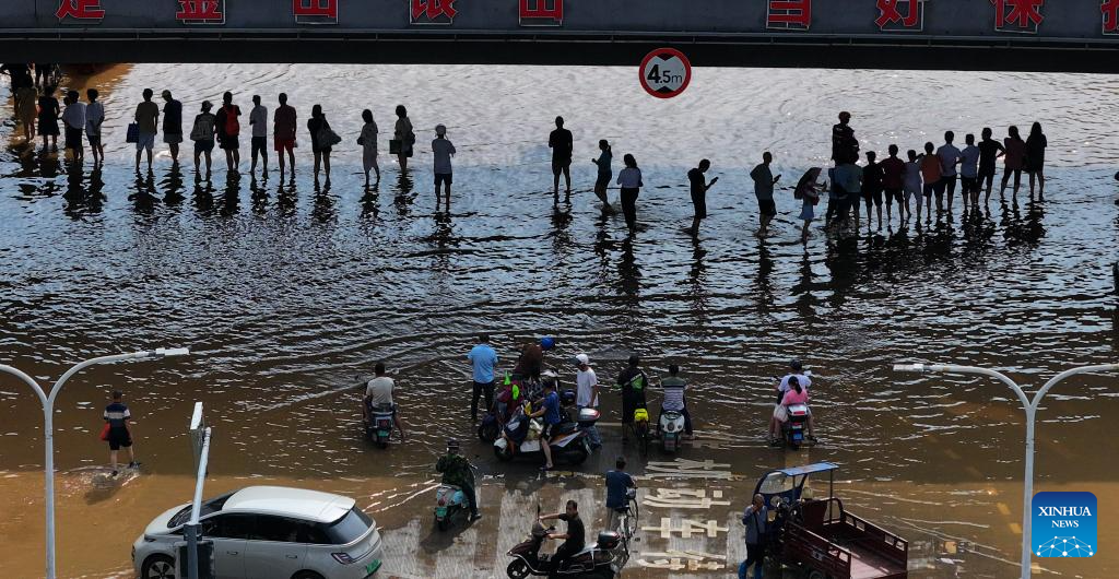 The city's urban area suffered severe waterlogging. Urbanites were seen carrying goods out of building basements. A resident surnamed Zhang said he began to remove supplies from the underground floor on Tuesday evening because of his worry about flood water potentially gushing in.