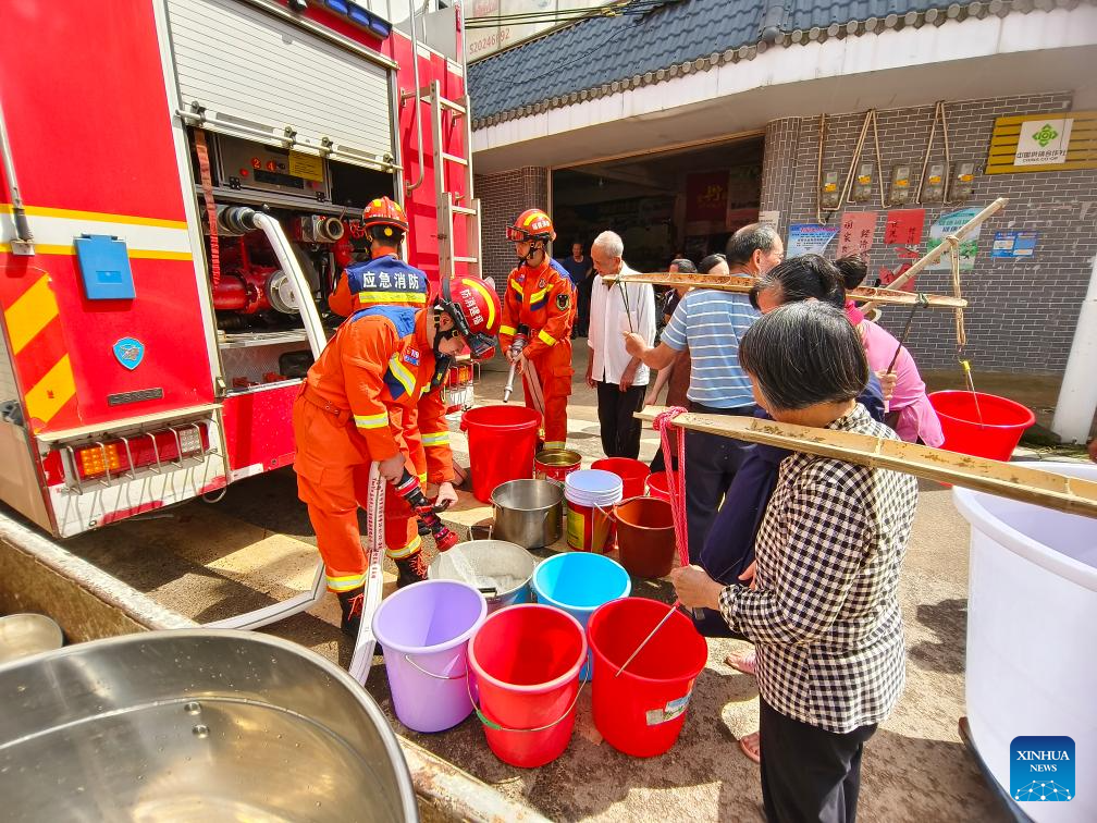 Firefighters provide clean water for flood-affected residents in Wuping County of Longyan City, southeast China's Fujian Province, June 20, 2024. (Xinhua)
