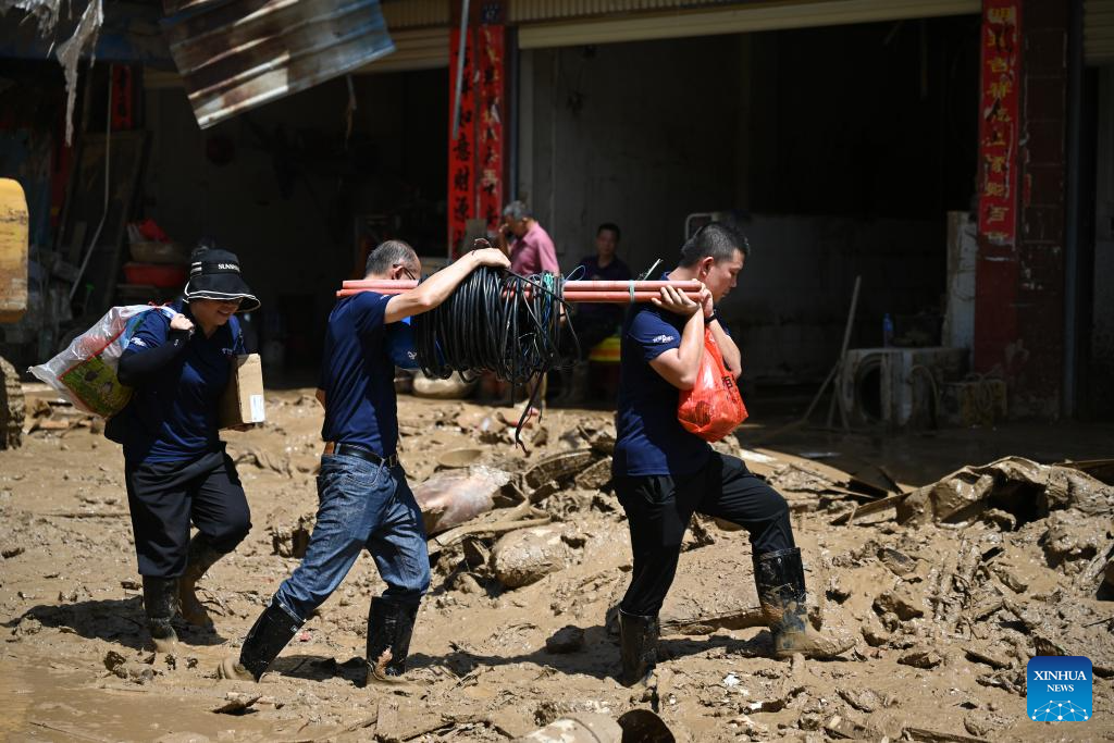 Rescuers clear debris in a flood-affected area in Sishui Township of Pingyuan County, Meizhou City, south China's Guangdong Province, June 20, 2024. (Xinhua/Lu Hanxin)