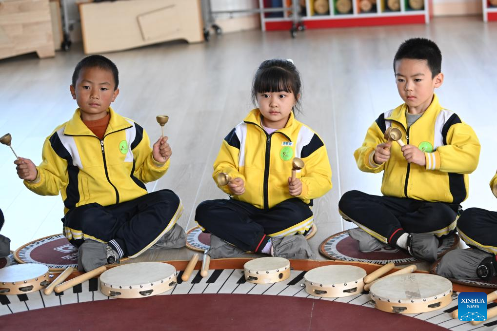 Children attend a music class at a kindergarten, which has a paired assistance relationship with Nanjing of Jiangsu Province, in Huangyuan County of Xining City, northwest China's Qinghai Province, Nov. 29, 2023. (Xinhua/Zhang Long)