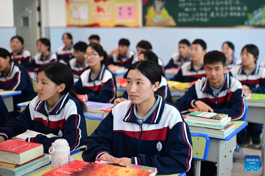 Students attend a class at the Golog-Xining Ethnic High School, which has a paired assistance relationship with Shanghai, in Xining City, northwest China's Qinghai Province, June 18, 2024. (Xinhua/Zhang Long)