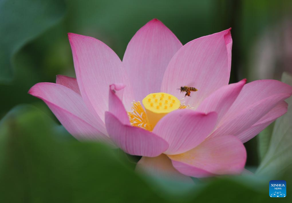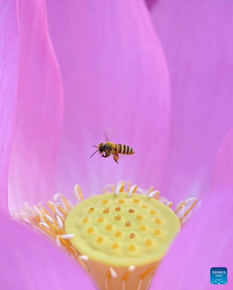 A bee approaches a lotus flower in Shuilian Village of Hengyang City, central China's Hunan Province, June 21, 2024. (Photo by Cao Zhengping/Xinhua)