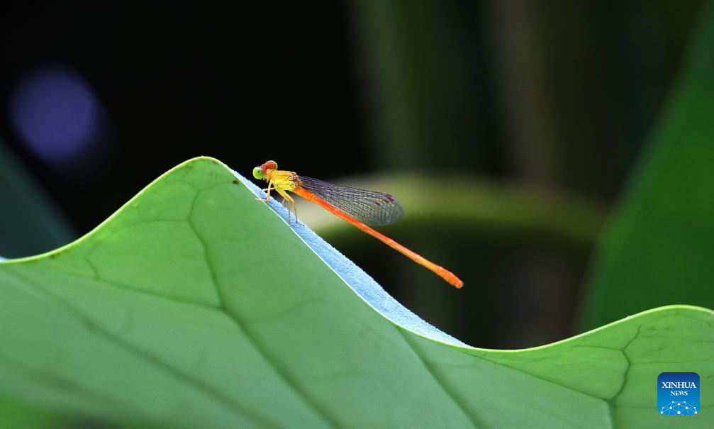 A dragonfly stays on the leaf of a lotus at a pond in Tancheng County, Linyi City, east China's Shandong Province, June 21, 2024. (Photo by Zhang Chunlei/Xinhua)