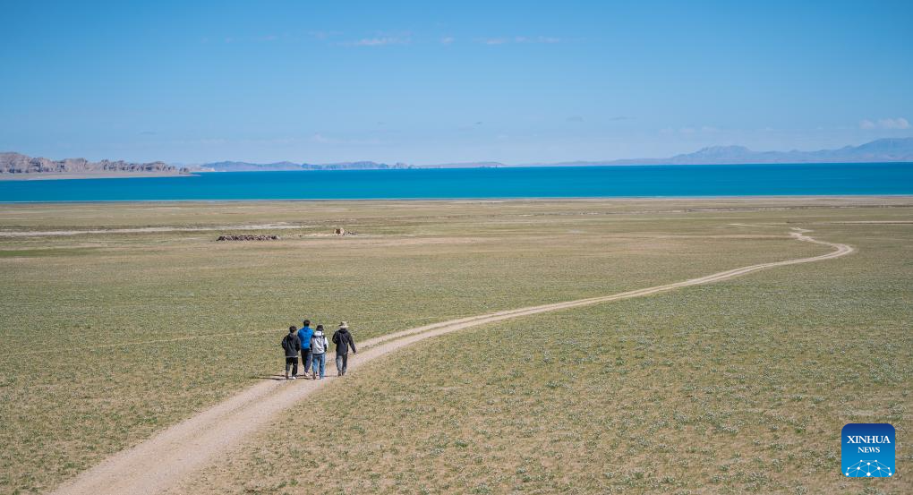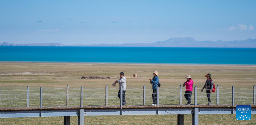 Tourists enjoy the scenery of Serling Tso Lake in southwest China's Xizang Autonomous Region, June 22, 2024. (Xinhua/Tenzin Nyida)