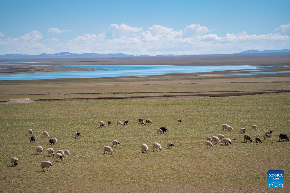 Sheep graze near Serling Tso Lake in southwest China's Xizang Autonomous Region, June 22, 2024. (Xinhua/Tenzin Nyida)