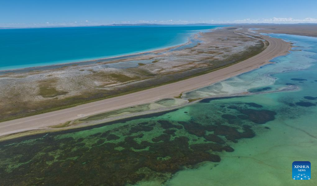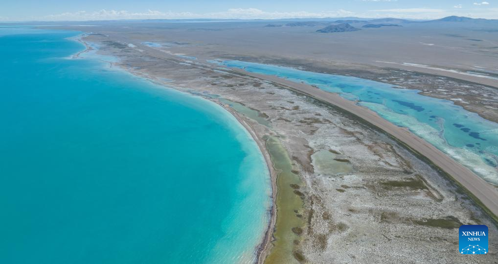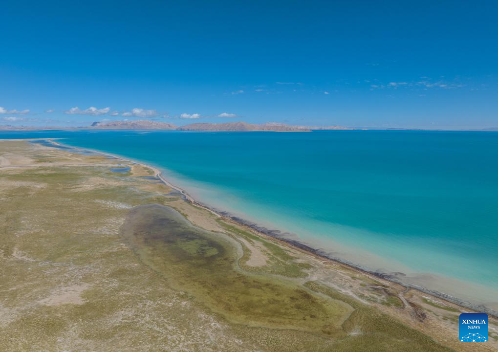 An aerial drone photo taken on June 22, 2024 shows the scenery of Serling Tso Lake in southwest China's Xizang Autonomous Region. (Xinhua/Tenzin Nyida)