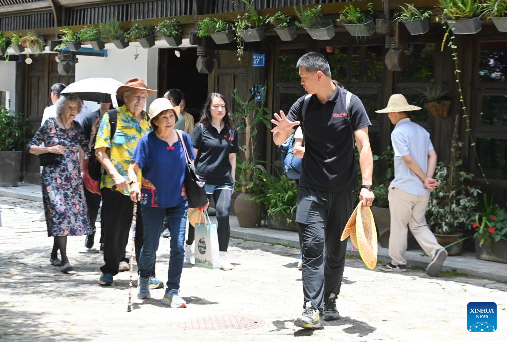 Lin Yinan (1st R, front), an associate professor at East China University of Science and Technology, introduces architecture history to foreign guests in Kuliang, Fuzhou, southeast China's Fujian Province, June 22, 2024. Kuliang, or Guling in Mandarin, is situated on the outskirts of Fuzhou. Since 1886, people from more than 20 countries, including Britain, France and the United States, began to build villas in Yixia Village in Kuliang to spend the summer, fostering a harmonious coexistence with local villagers and thus contributing to the enduring "Kuliang stories." (Xinhua/Lin Shanchuan)