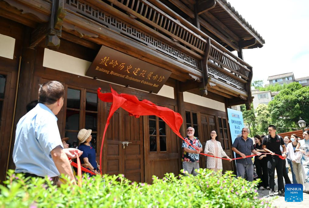 People attend the unveiling ceremony of Kuliang Historical Architecture Exhibition Hall in Kuliang, Fuzhou, southeast China's Fujian Province, June 22, 2024. Kuliang, or Guling in Mandarin, is situated on the outskirts of Fuzhou. Since 1886, people from more than 20 countries, including Britain, France and the United States, began to build villas in Yixia Village in Kuliang to spend the summer, fostering a harmonious coexistence with local villagers and thus contributing to the enduring "Kuliang stories." (Xinhua/Lin Shanchuan)