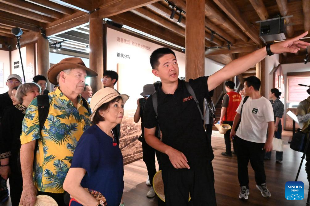 Lin Yinan (1st R, front), an associate professor at East China University of Science and Technology, introduces architecture history to the Gondon Trimble couple at Kuliang Historical Architecture Exhibition Hall in Kuliang, Fuzhou, southeast China's Fujian Province, June 22, 2024. Kuliang, or Guling in Mandarin, is situated on the outskirts of Fuzhou. Since 1886, people from more than 20 countries, including Britain, France and the United States, began to build villas in Yixia Village in Kuliang to spend the summer, fostering a harmonious coexistence with local villagers and thus contributing to the enduring "Kuliang stories." (Xinhua/Lin Shanchuan)
