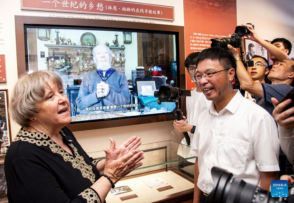 Elyn MacInnis (1st L) , an adviser to the Kuliang tourism and culture research association, tells story of Leonard Billing at Kuliang Families Story Museum in Kuliang, Fuzhou, southeast China's Fujian Province, June 22, 2024. Kuliang, or Guling in Mandarin, is situated on the outskirts of Fuzhou. Since 1886, people from more than 20 countries, including Britain, France and the United States, began to build villas in Yixia Village in Kuliang to spend the summer, fostering a harmonious coexistence with local villagers and thus contributing to the enduring "Kuliang stories." (Xinhua/Wei Peiquan)