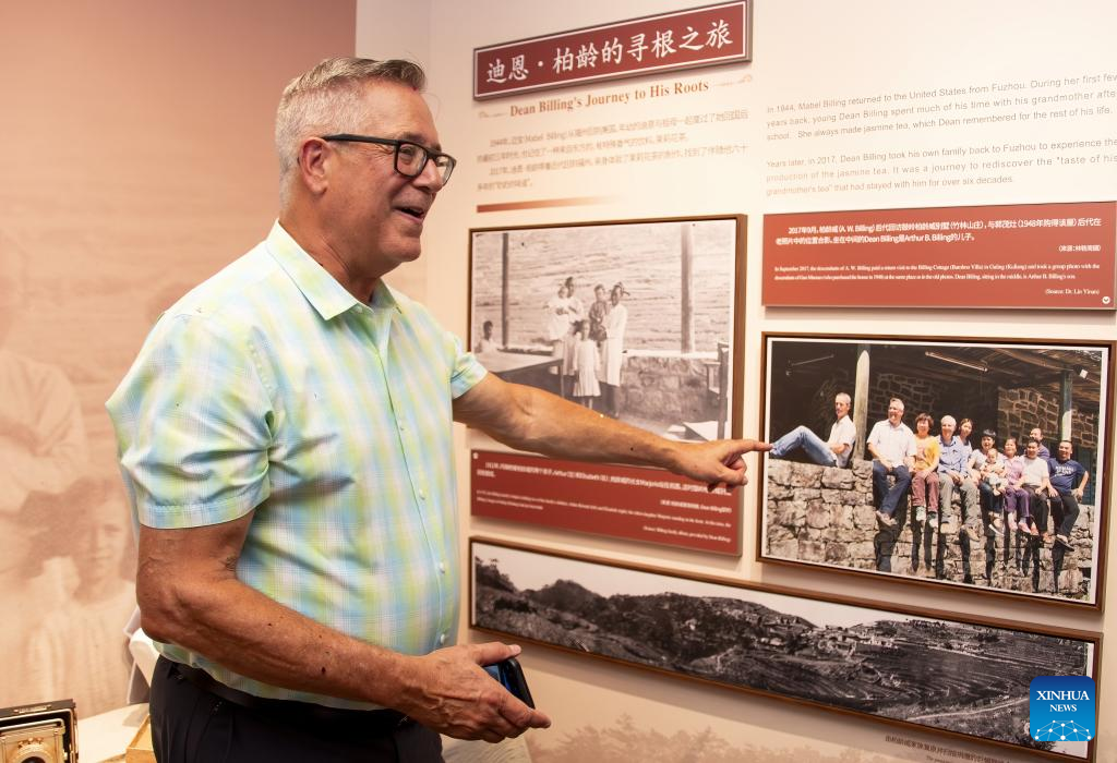 A descendant of Dean Billing's family from the United States points at himself in a photo at Kuliang Families Story Museum in Kuliang, Fuzhou, southeast China's Fujian Province, June 22, 2024. Kuliang, or Guling in Mandarin, is situated on the outskirts of Fuzhou. Since 1886, people from more than 20 countries, including Britain, France and the United States, began to build villas in Yixia Village in Kuliang to spend the summer, fostering a harmonious coexistence with local villagers and thus contributing to the enduring "Kuliang stories." (Xinhua/Wei Peiquan)
