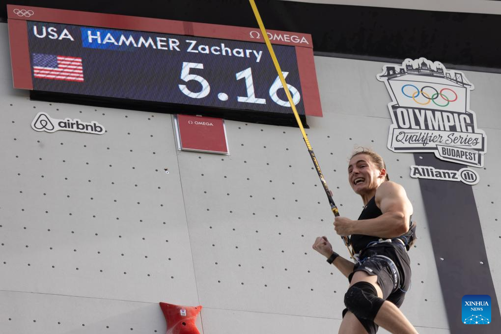 Zachary Hammer of the United States reacts during the qualification of men's speed of sport climbing at the Olympic Qualifier Series Budapest in Budapest, Hungary, June 21, 2024. (Photo by Attila Volgyi/Xinhua)