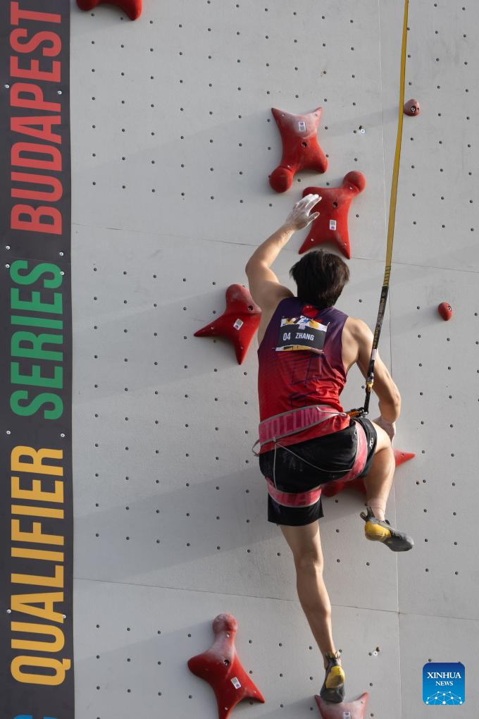 Zhang Liang of China competes during the qualification of men's speed of sport climbing at the Olympic Qualifier Series Budapest in Budapest, Hungary, June 21, 2024. (Photo by Attila Volgyi/Xinhua)