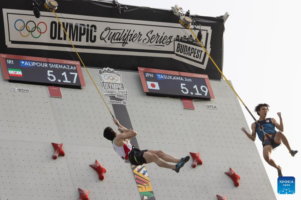 Yasukawa Jun (R) of Japan celebrates during the qualification of men's speed of sport climbing at the Olympic Qualifier Series Budapest in Budapest, Hungary, June 21, 2024. (Photo by Attila Volgyi/Xinhua)