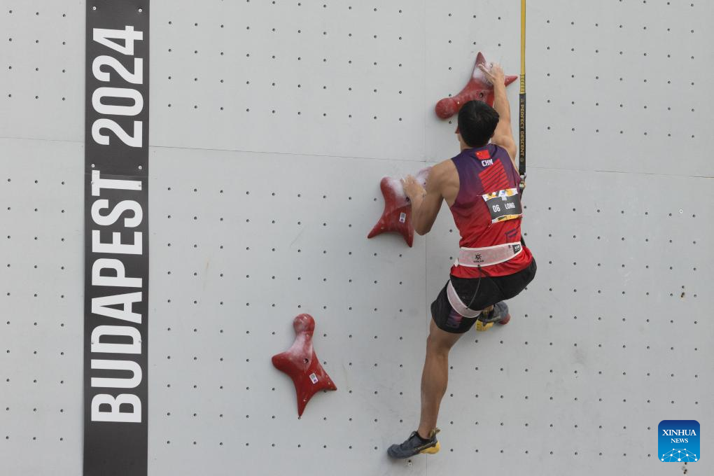 Long Jianguo of China competes during the qualification of men's speed of sport climbing at the Olympic Qualifier Series Budapest in Budapest, Hungary, June 21, 2024. (Photo by Attila Volgyi/Xinhua)