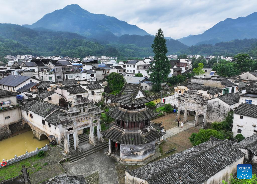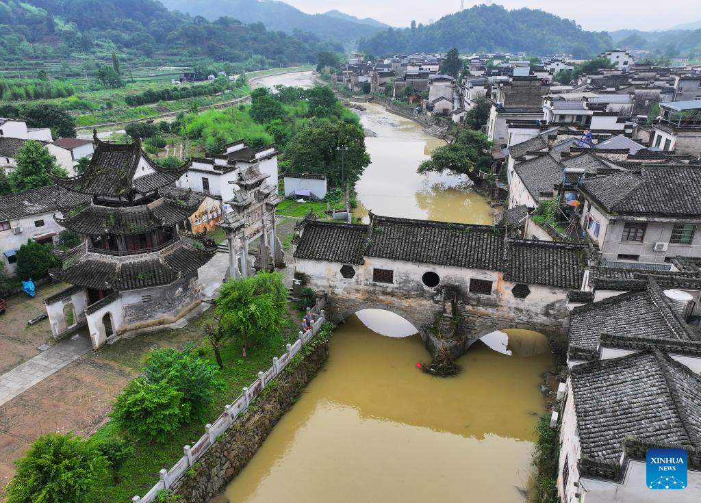 An aerial photo taken on June 22, 2024 shows the ancient architecture complex in Xucun Village of Xucun Town, Huangshan City, east China's Anhui Province. The city of Huangshan raised the emergency response level for flood control to Level II on Thursday. The precipitation in the city's Xucun Village has surpassed 520 mm since Wednesday. Up to now, the village's 16 national level cultural relics protection sites are in good condition. (Xinhua/Du Yu)