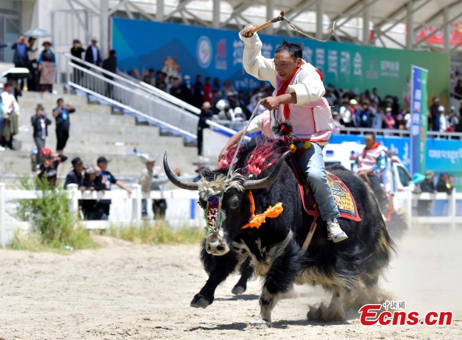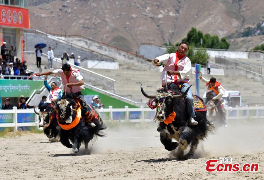 The photo shows the scene of the yak-riding finals of the first farmers and herdsmen games in Lhasa, southwest China's Xizang Autonomous Region on June 23. (Photo: China News Service/ Li Lin)