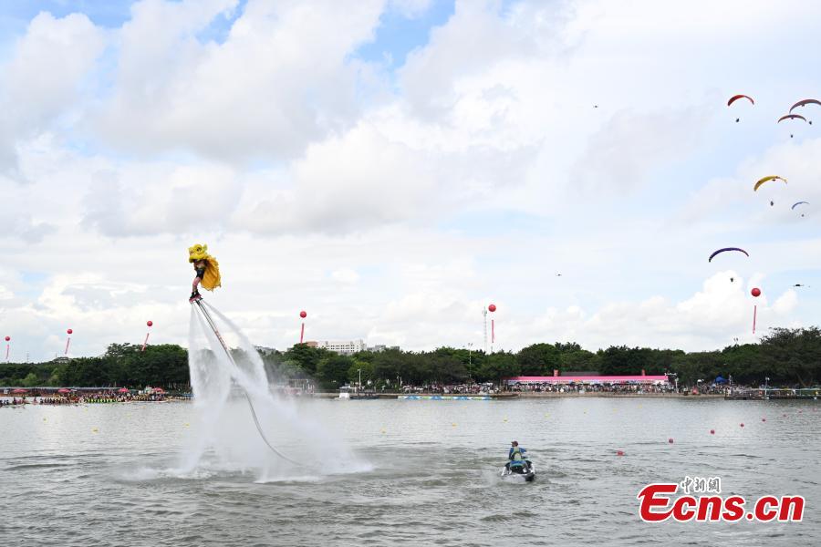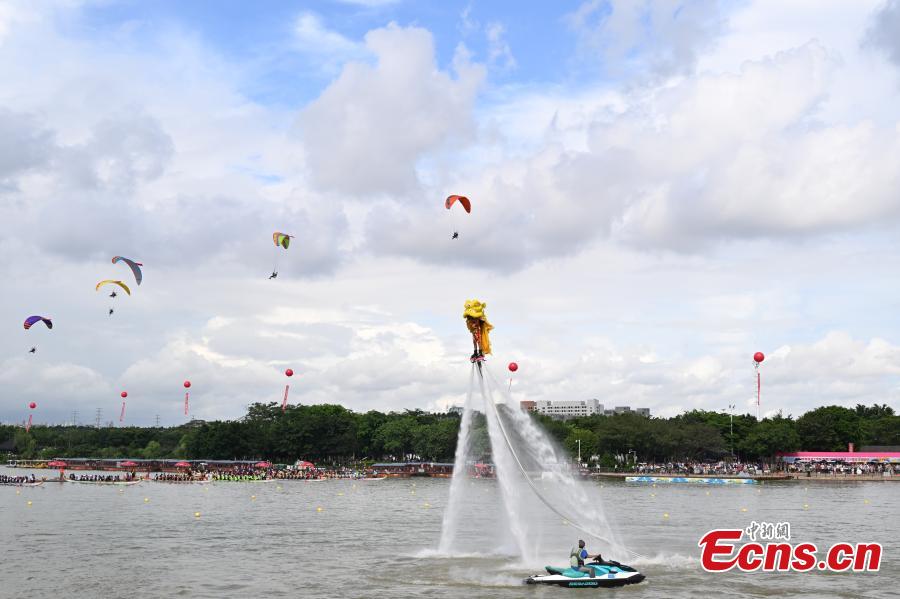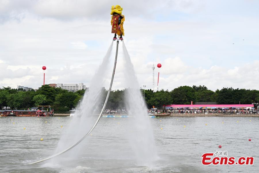 Lion dance performances are staged on the water to cheer for a dragon boat race at Huayang Lake National Wetland Park, Mayong Town, Dongguan City, Guangdong Province on June 23. (Photo: China News Service/ Chen Chuhong)