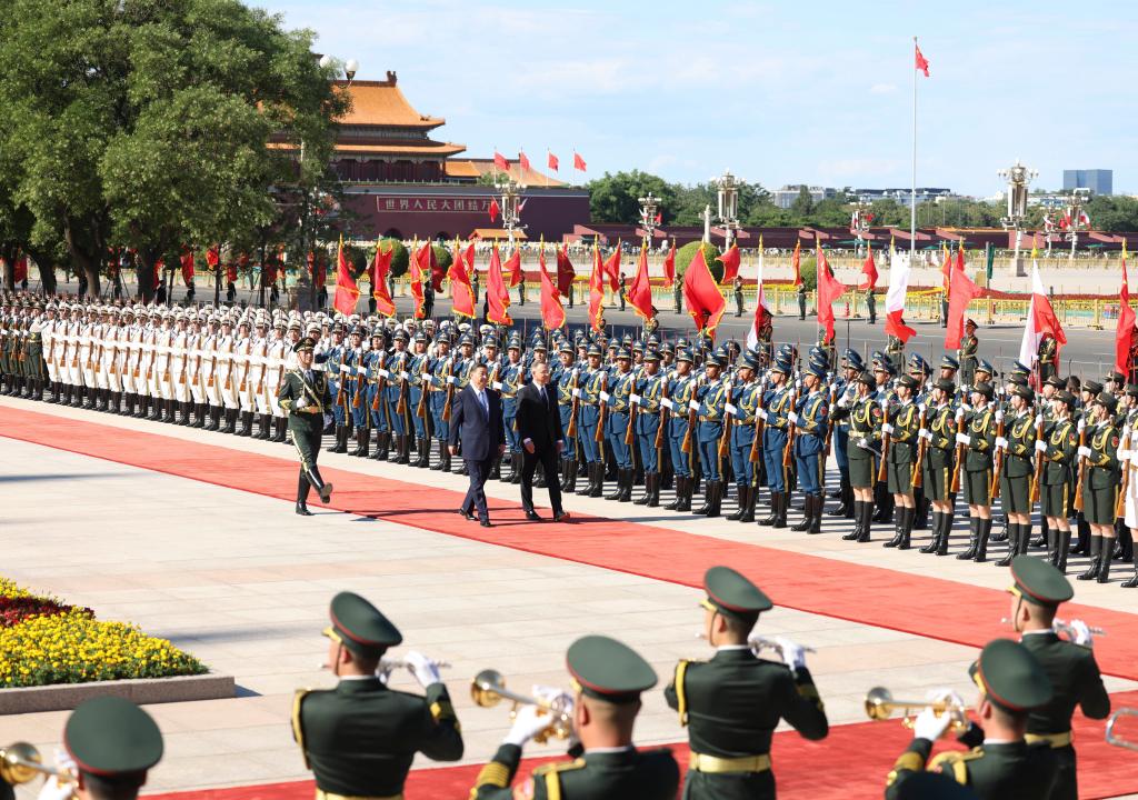 Chinese President Xi Jinping holds a welcome ceremony for Polish President Andrzej Duda, who is on a state visit to China, at the square outside the east gate of the Great Hall of the People prior to the talks between Xi and Duda, in Beijing, capital of China, June 24, 2024. Xi held talks with Duda at the Great Hall of the People in Beijing on Monday. (Xinhua/Yue Yuewei)