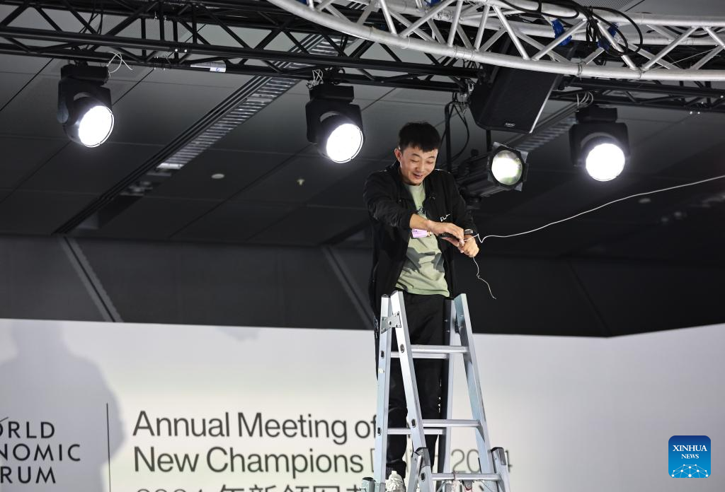 A worker adjusts light equipment at the Dalian International Conference Center, venue of the 2024 Summer Davos, in Dalian, northeast China's Liaoning Province, June 24, 2024. (Xinhua/Yang Qing)