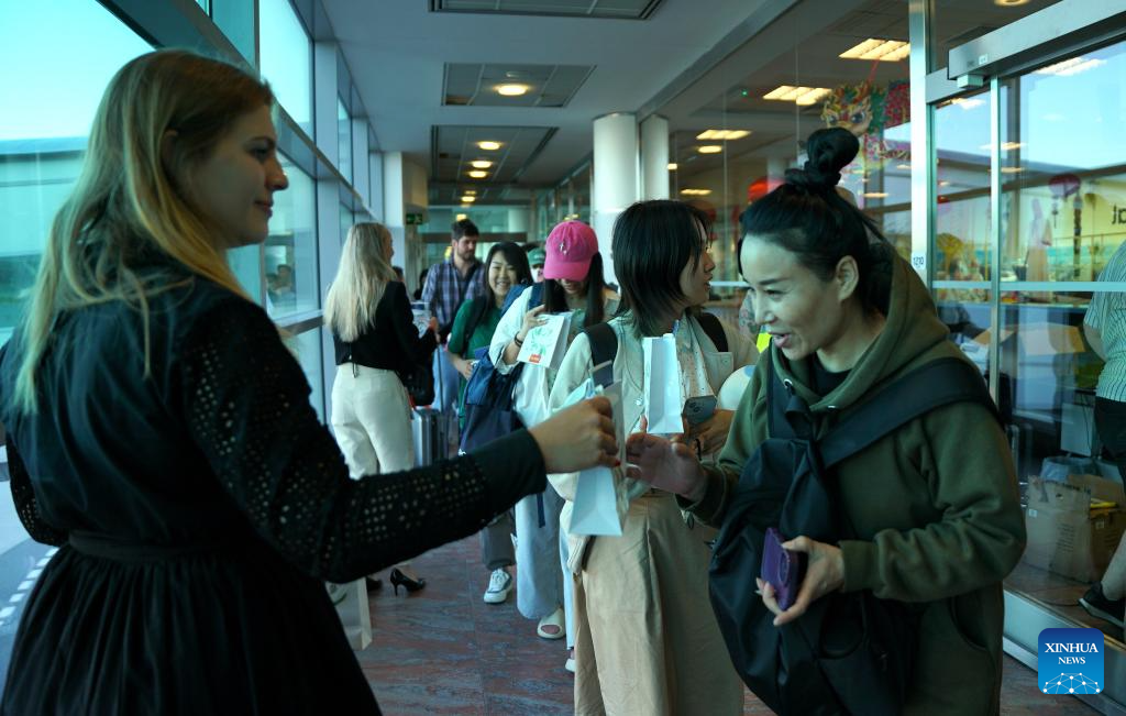 Passengers from a Hainan Airlines plane are welcomed upon their arrival at the Prague Airport in Prague, the Czech Republic, on June 24, 2024. Direct flights between the capital cities of China and the Czech Republic officially resumed on Monday, with the arrival of a Hainan Airlines aircraft at the Prague Airport in the early morning after a 10-hour flight. (Photo by Dana Kesnerova/Xinhua)