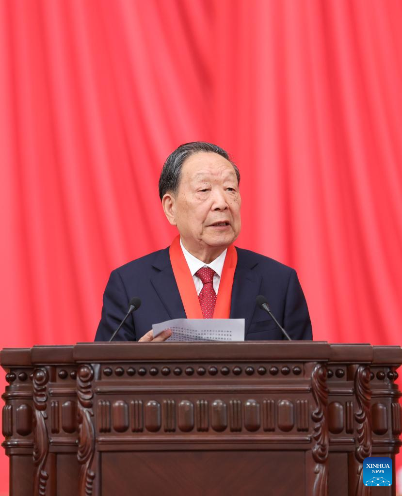 Li Deren, an academician of both the Chinese Academy of Sciences (CAS) and the Chinese Academy of Engineering (CAE) from Wuhan University, who won the national top sci-tech award for the year 2023, speaks on behalf of all the national science and technology award recipients at the Great Hall of the People in Beijing, capital of China, June 24, 2024. A meeting conflating the national sci-tech conference, the national science and technology award conference, and the general assemblies of the members of the Chinese Academy of Sciences (CAS) and the Chinese Academy of Engineering (CAE) was held here on Monday. (Xinhua/Yao Dawei)