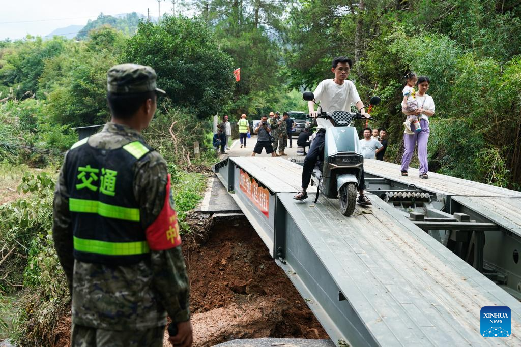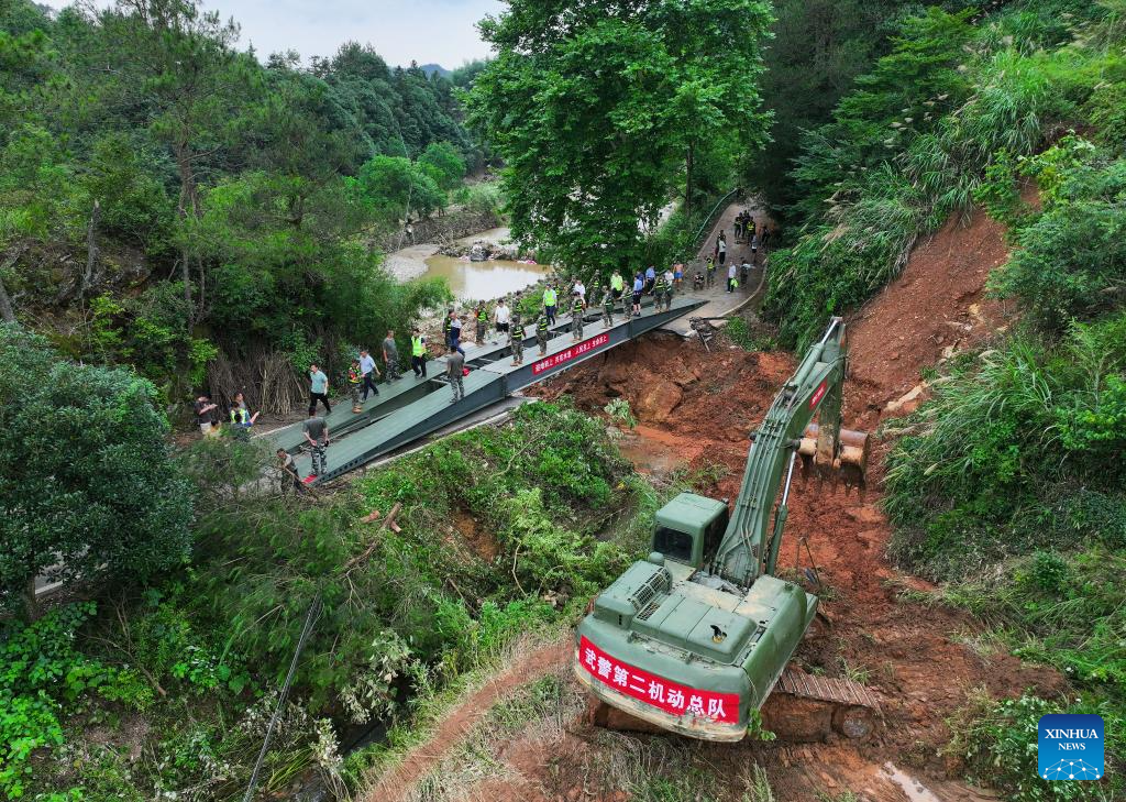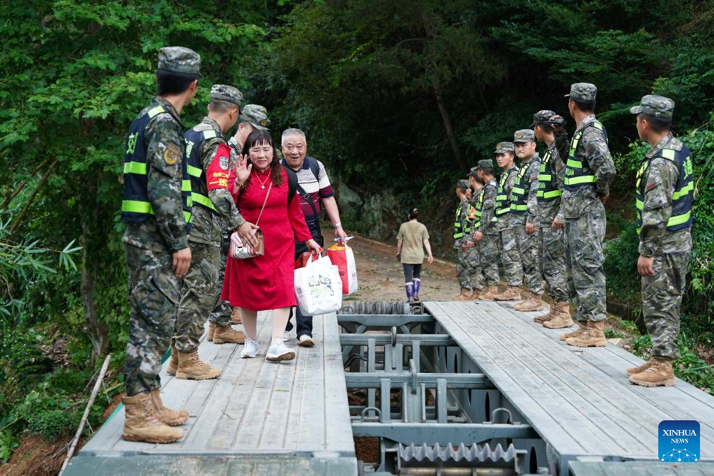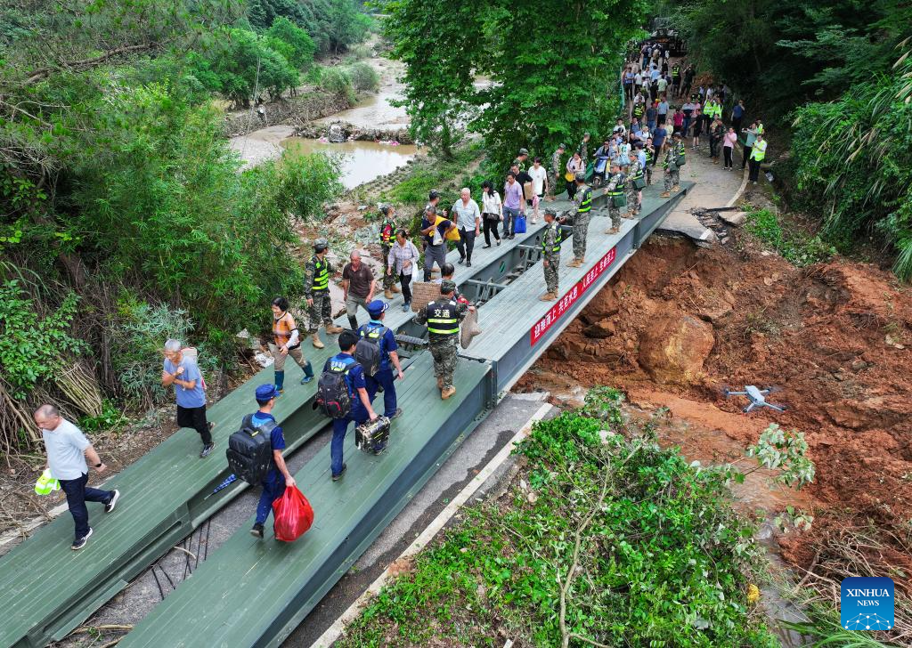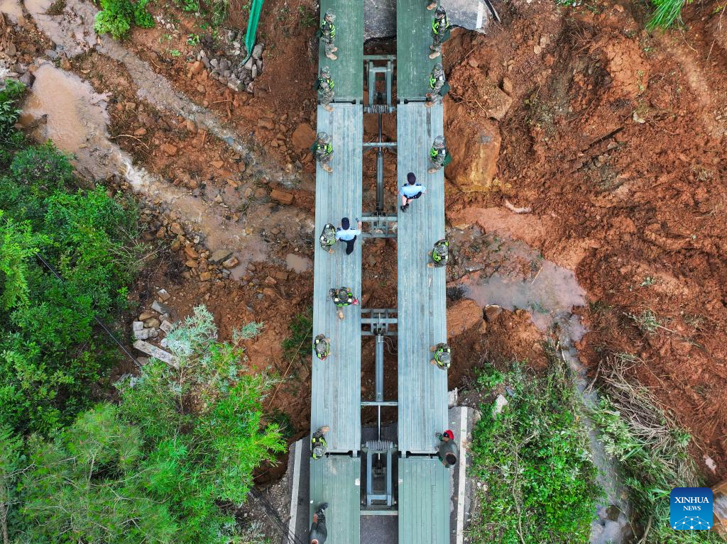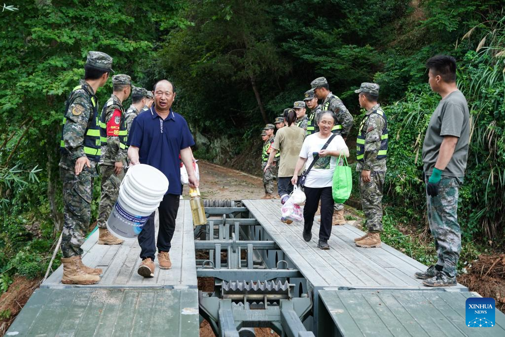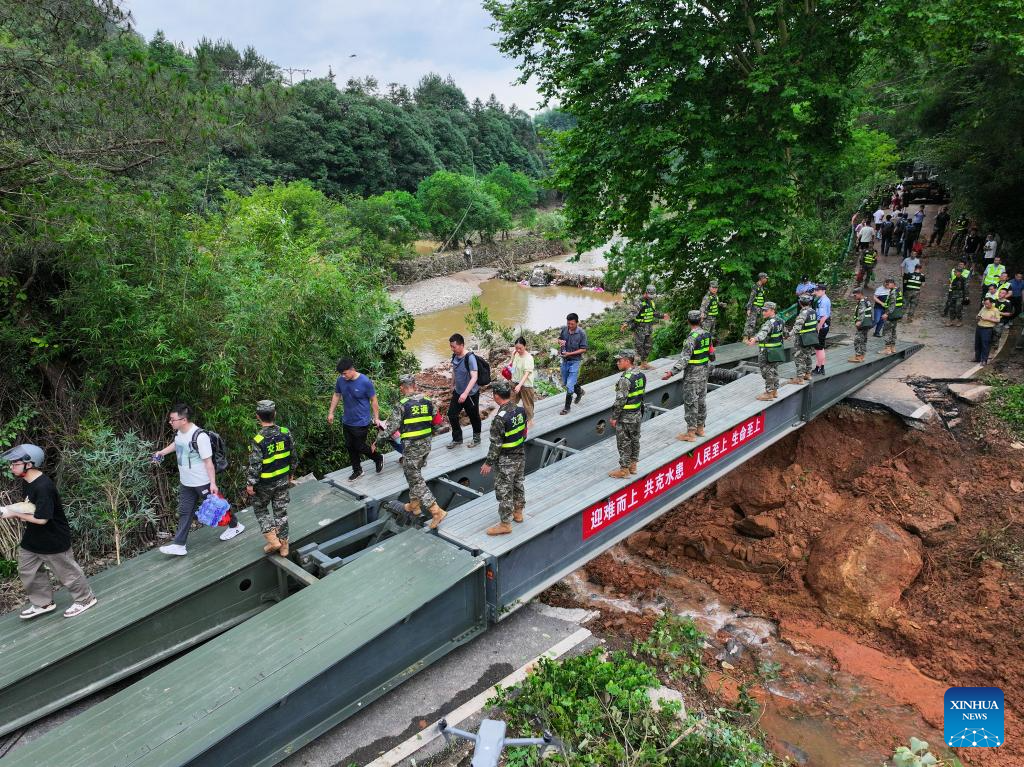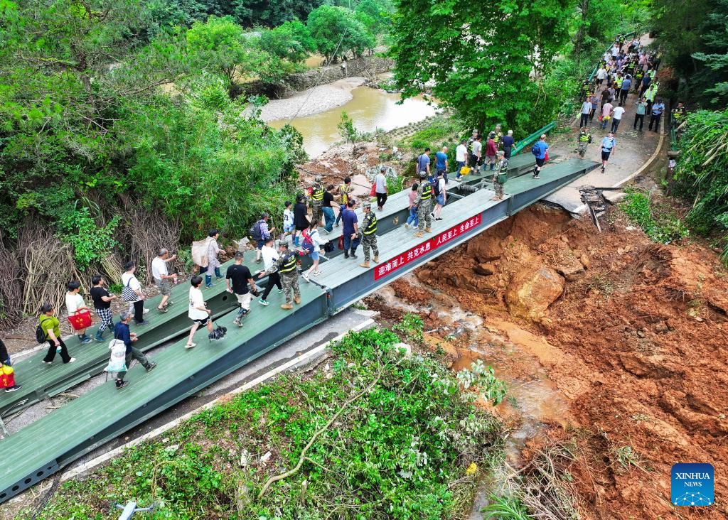 Villagers walk on a temporary bridge built by armed police force in Xiaoxi Village of Shaolian Township in Shexian County, east China's Anhui Province, June 22, 2024. Heavy rainfall that battered Shaolian Township had cut off power and telecommunication supplies in some villages. Armed police force has been carrying out clean-up work and bridge building to resume transportation in flood-affected areas. (Xinhua/Du Yu)