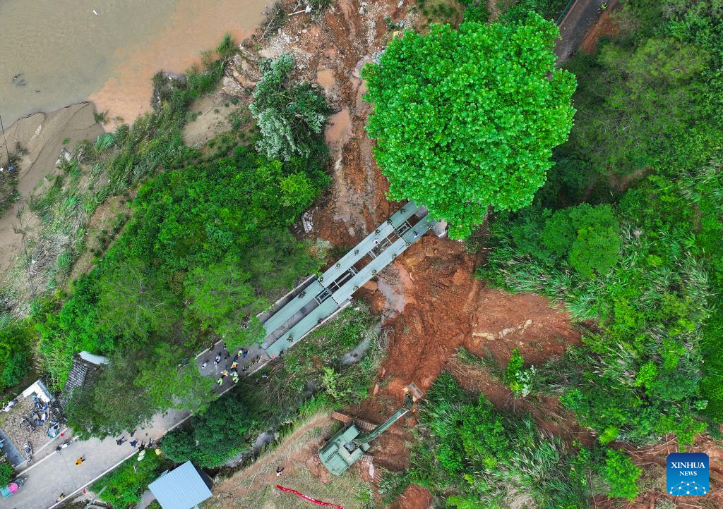 An aerial drone photo taken on June 22, 2024 shows a temporary bridge built by armed police force in Xiaoxi Village of Shaolian Township, Shexian County, east China's Anhui Province. Heavy rainfall that battered Shaolian Township had cut off power and telecommunication supplies in some villages. Armed police force has been carrying out clean-up work and bridge building to resume transportation in flood-affected areas. (Xinhua/Du Yu)