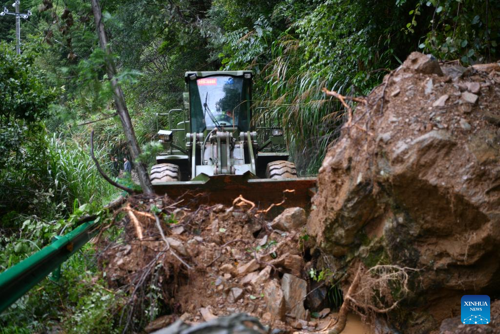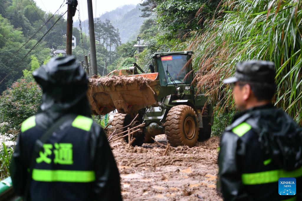 Members of the armed police force operate machinery to clean up muds and gravels on a road heading for Guzhu Village in Shaolian Township, Shexian County, east China's Anhui Province, June 23, 2024. Heavy rainfall that battered Shaolian Township had cut off power and telecommunication supplies in some villages. Armed police force has been carrying out clean-up work and bridge building to resume transportation in flood-affected areas. (Photo by Yu Kangsheng/Xinhua)