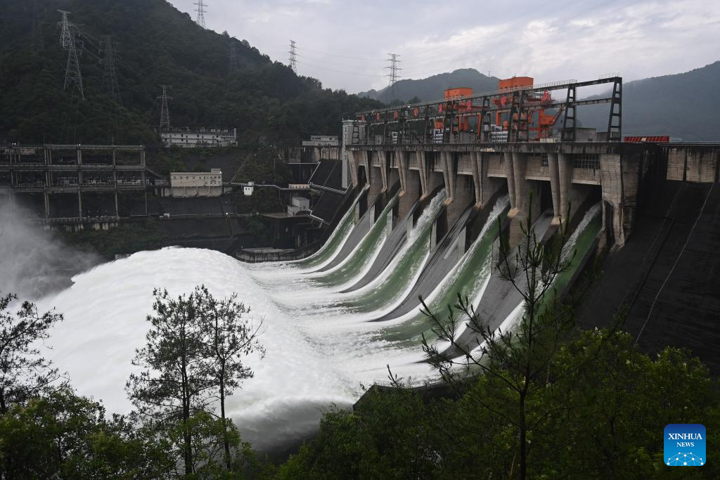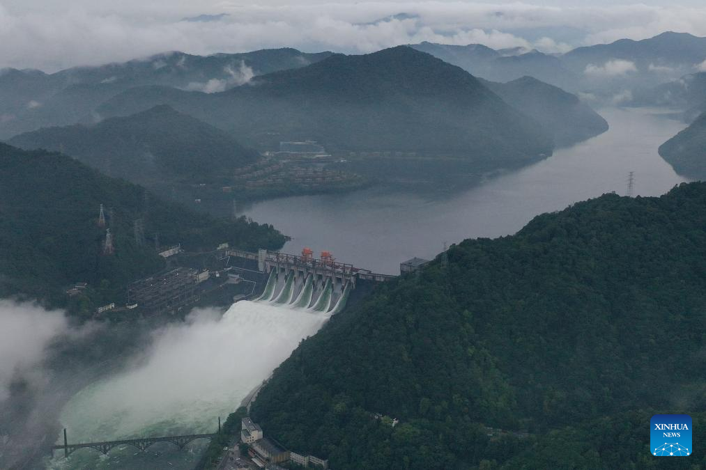 This photo taken on June 24, 2024 shows the Xin'an River Reservoir releasing water for flood control in Jiande City, east China's Zhejiang Province. (Xinhua/Huang Zongzhi)