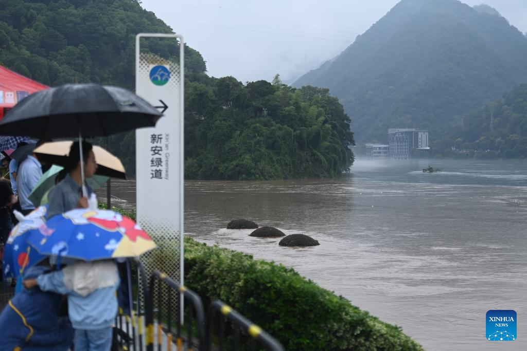 Citizens check the flood water on the bank of the Xin'an River in Jiande City, east China's Zhejiang Province on June 24, 2024. (Xinhua/Huang Zongzhi)
