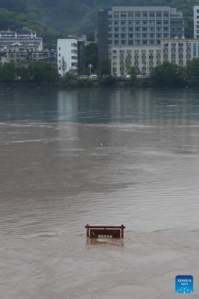 This photo taken on June 24, 2024 shows an almost submerged signboard on the bank of the Xin'an River in Jiande City, east China's Zhejiang Province. (Xinhua/Huang Zongzhi)