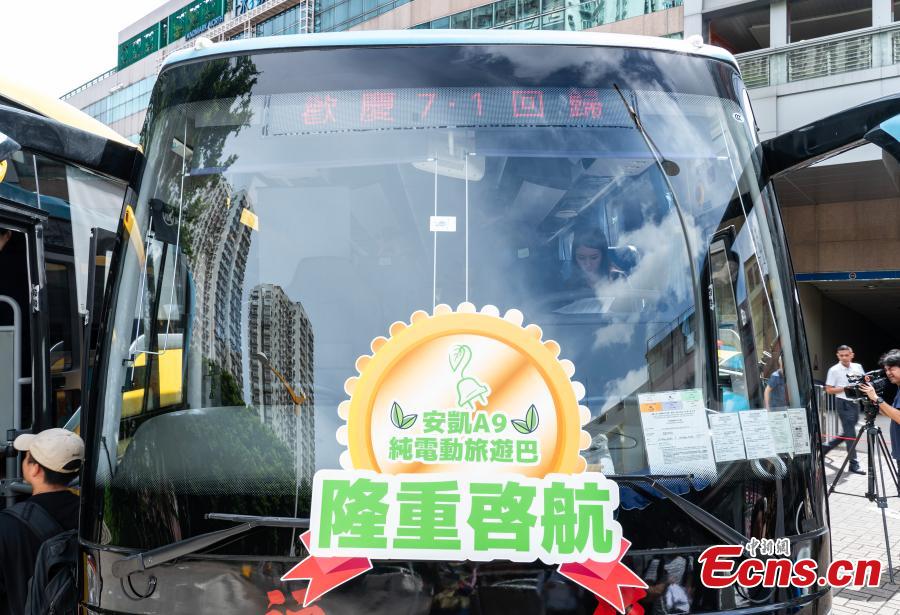 An inauguration ceremony for the operation of the first cross-border electric tourist coach between Hong Kong Special Administrative Region and Shenzhen City in Guangdong Province is held at a cross-boundary coach terminal in Sheung Shui, Hong Kong on June 24. (Photo: China News Service/Hou Yu)