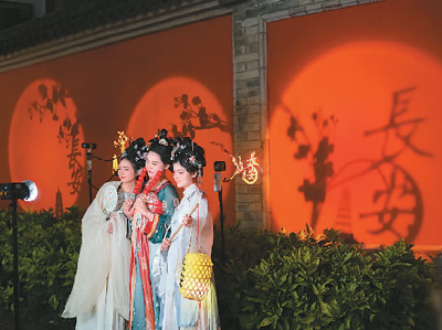 Tourists dressed in traditional Chinese costumes pose for group photos at the Datang Everbright City, a tourist landmark featuring a grand street with characteristics of the Tang Dynasty (618-907), in Xi'an, capital of northwest China's Shaanxi Province. (Photo/Weng Qiyu)