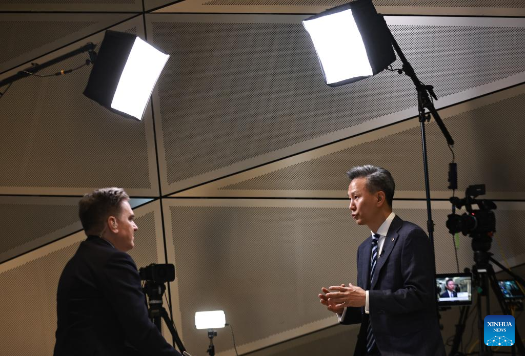 A guest receives an interview at the 2024 Summer Davos in Dalian, northeast China's Liaoning Province, June 25, 2024. (Xinhua/Yang Qing)