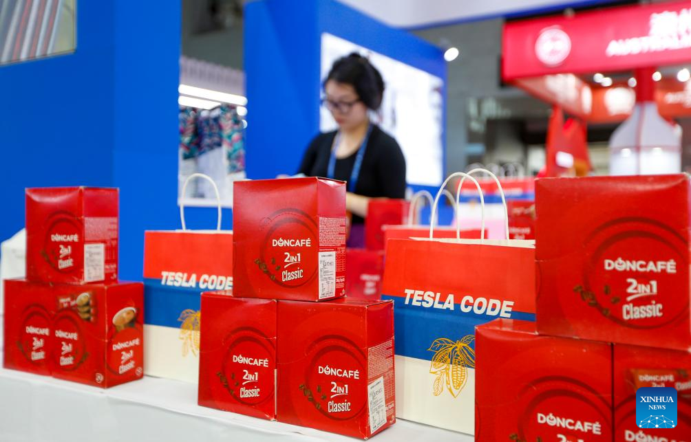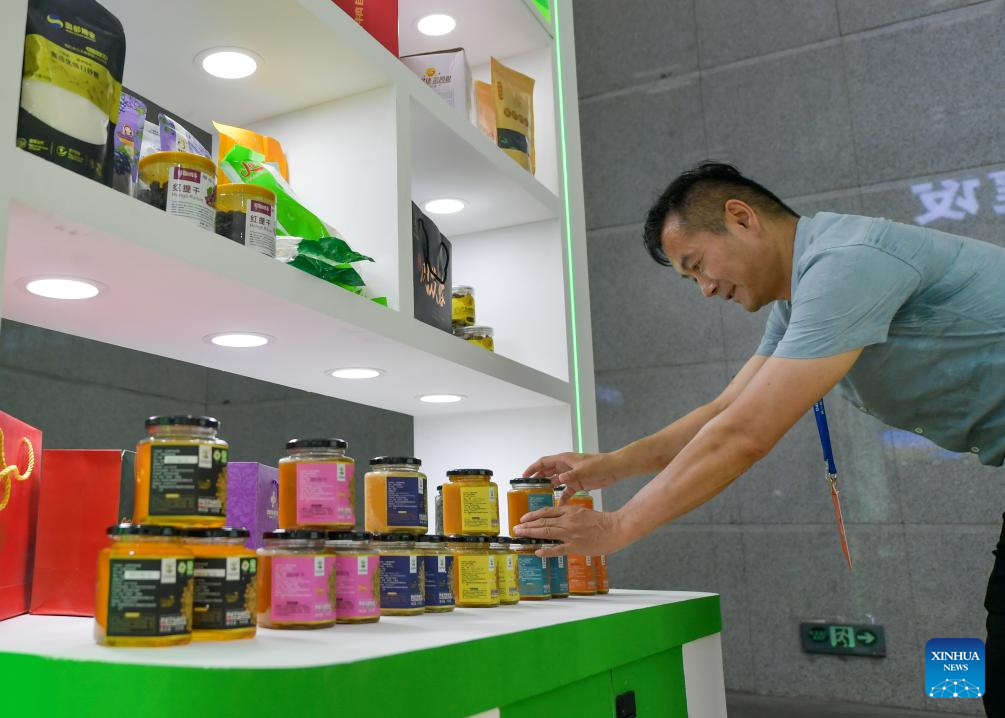 A staff member organizes exhibits at the booth of Serbia of the 8th China-Eurasia Expo in Urumqi, northwest China's Xinjiang Uygur Autonomous Region, June 25, 2024. The 8th China-Eurasia Expo will be held from June 26 to 30 in northwest China's Xinjiang. The expo will cover an area of 140,000 square meters with four major exhibition zones covering investment cooperation, international exhibition, special industries, and equipment manufacturing. (Xinhua/Chen Shuo)