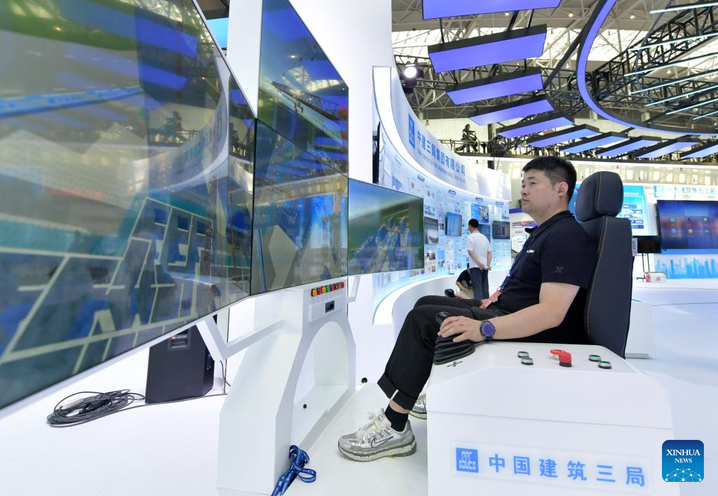 A worker adjusts the 5G tower crane simulator at the venue of the 8th China-Eurasia Expo in Urumqi, northwest China's Xinjiang Uygur Autonomous Region, June 25, 2024. The 8th China-Eurasia Expo will be held from June 26 to 30 in northwest China's Xinjiang. The expo will cover an area of 140,000 square meters with four major exhibition zones covering investment cooperation, international exhibition, special industries, and equipment manufacturing. (Xinhua/Wang Fei)