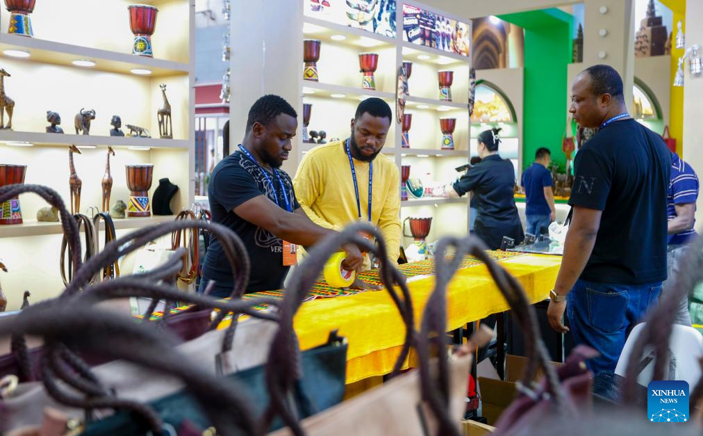 Staff organize exhibits at the booth of Ghana of the 8th China-Eurasia Expo in Urumqi, northwest China's Xinjiang Uygur Autonomous Region, June 25, 2024. The 8th China-Eurasia Expo will be held from June 26 to 30 in northwest China's Xinjiang. The expo will cover an area of 140,000 square meters with four major exhibition zones covering investment cooperation, international exhibition, special industries, and equipment manufacturing. (Xinhua/Chen Shuo)