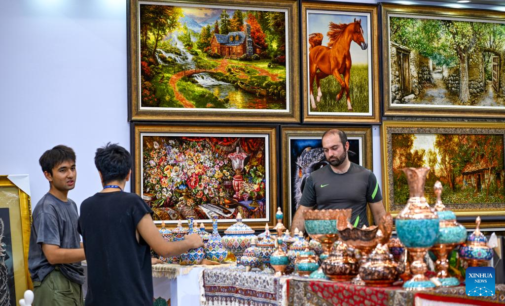 Staff members organize exhibits at the booth of Iran of the 8th China-Eurasia Expo in Urumqi, northwest China's Xinjiang Uygur Autonomous Region, June 25, 2024. The 8th China-Eurasia Expo will be held from June 26 to 30 in northwest China's Xinjiang. The expo will cover an area of 140,000 square meters with four major exhibition zones covering investment cooperation, international exhibition, special industries, and equipment manufacturing. (Xinhua/Chen Shuo)