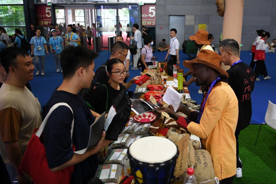 Visitors (L) shop in the Changsha International Convention and Exhibition Center during the third China-Africa Economic and Trade Expo in Changsha, central China's Hunan Province, July 1, 2023. (Xinhua/Chen Zhenhai)