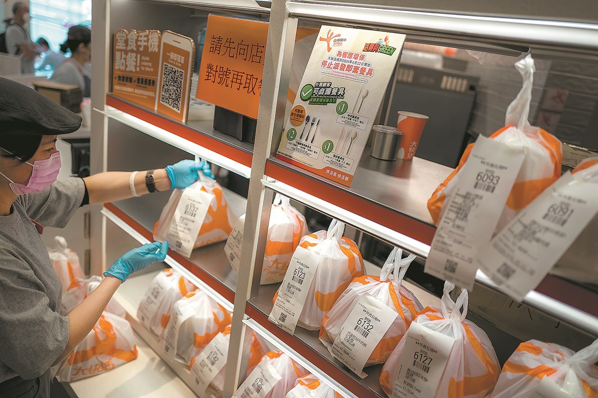 Residents purchase takeout from a restaurant at Admiralty, Hong Kong, in April, as the city began to enforce the first-phase ban on disposable plastic products in restaurants and hotels. (ANDY CHONG/CHINA DAILY)