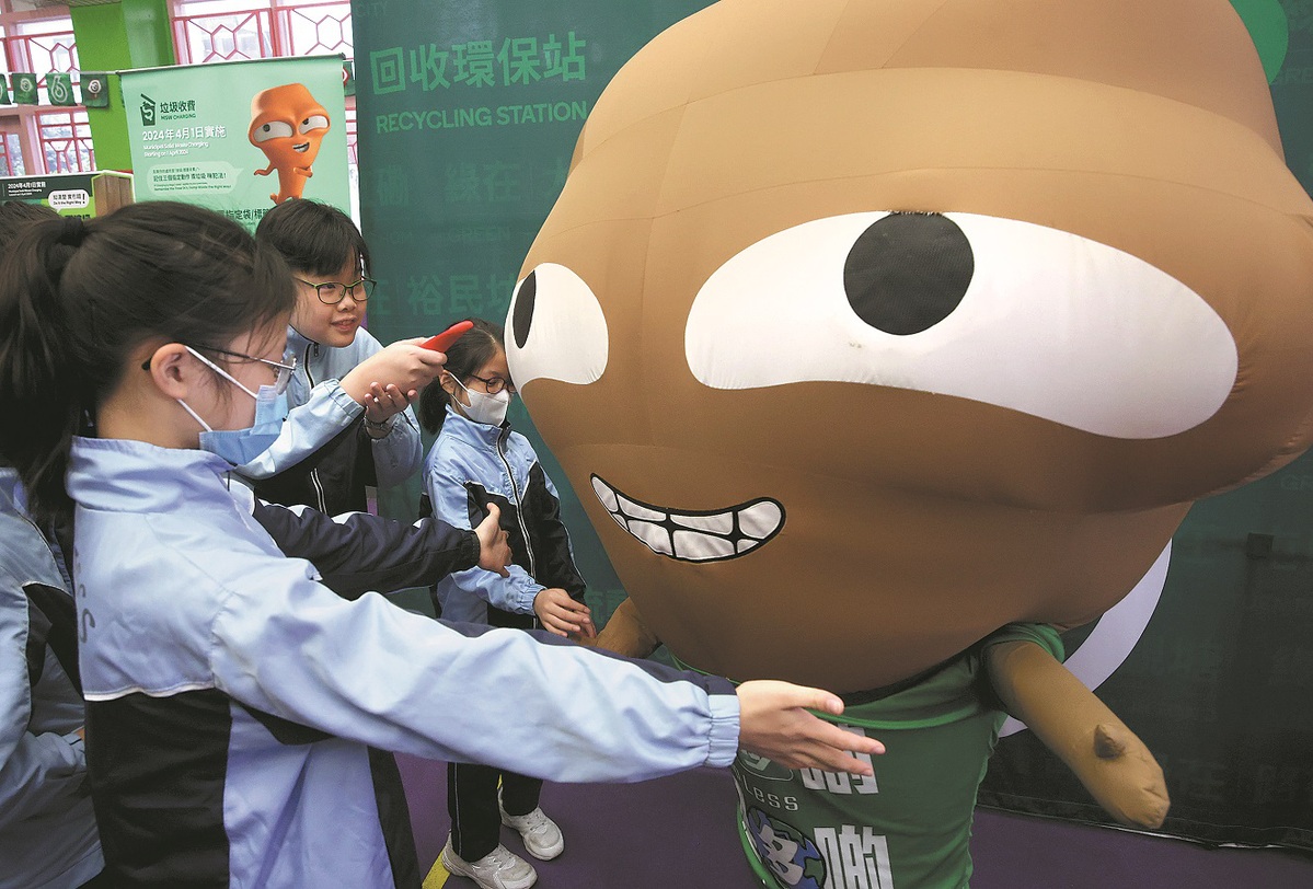 Students participate in educational activities on waste reduction and the city's waste-charging plan at a primary school in HK on Jan 16. Multiple booths were set up in the school hall to demonstrate ways to reduce waste at the source and promote recycling. (CALVIN NG/CHINA DAILY)