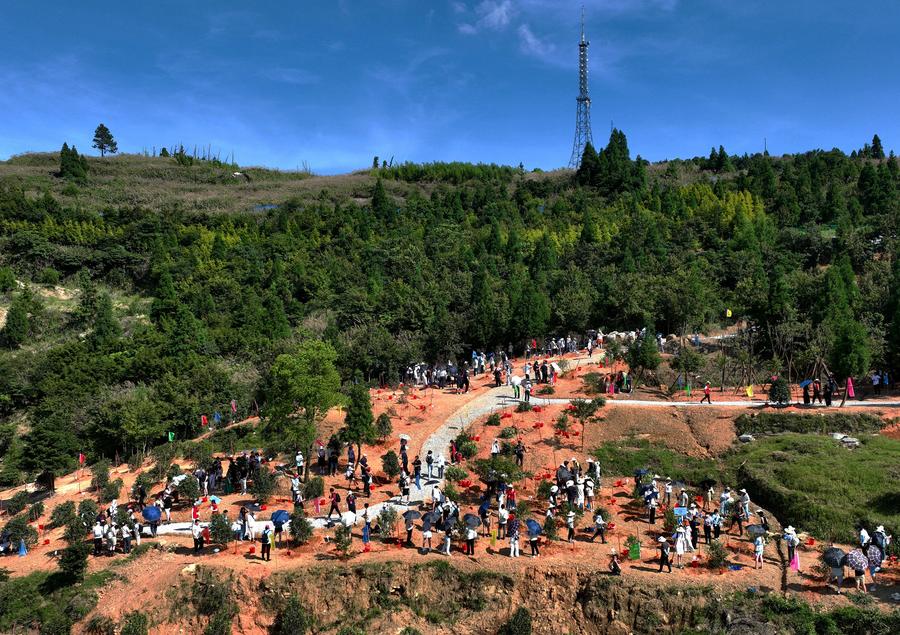 A drone photo taken on June 24, 2024 shows Chinese and foreign participants of "Bond with Kuliang: 2024 China-U.S. Youth Festival" planting trees of friendship in Kuliang, Fuzhou, southeast China's Fujian Province. (Xinhua/Wei Peiquan)