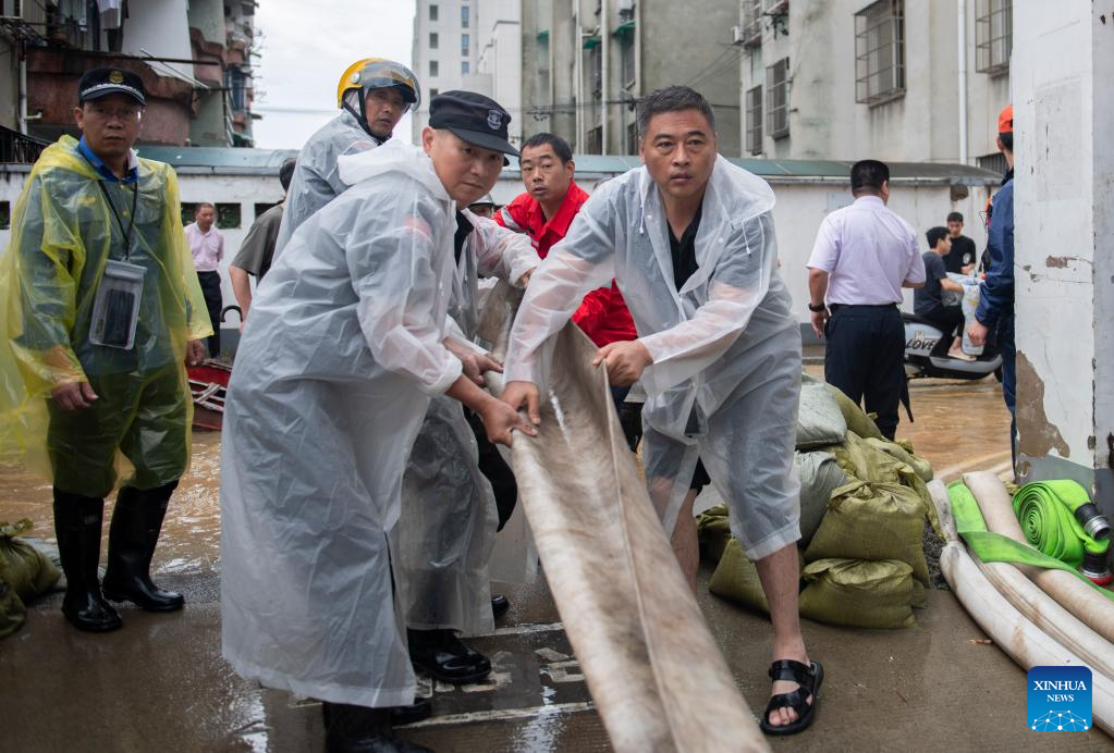 Emergency response workers deploy pumping pipes at a local community in Tunxi District of Huangshan City, east China's Anhui Province, June 24, 2024. Rare and heavy rainfall has hit Huangshan recently, triggering flood situations in the city. Local emergency response authorities have been promptly deploying manpower and resources, draining floodwater, cleaning up muds and relocating affected residents. (Xinhua/Fu Tian)